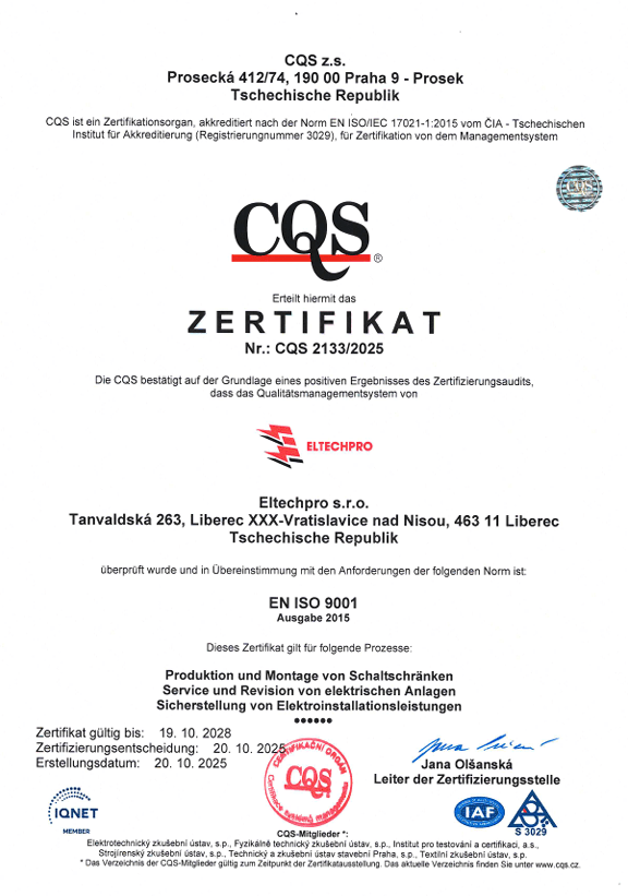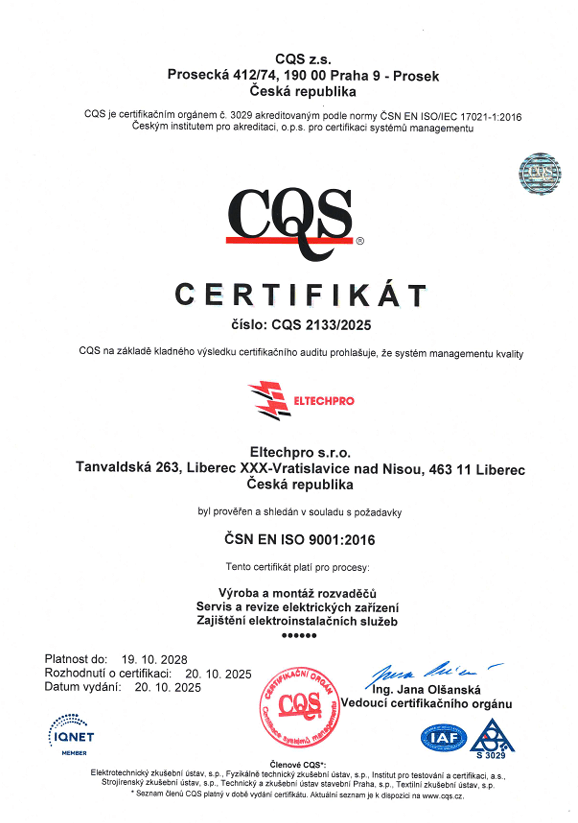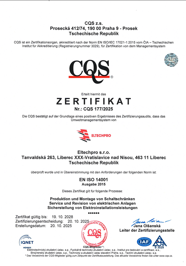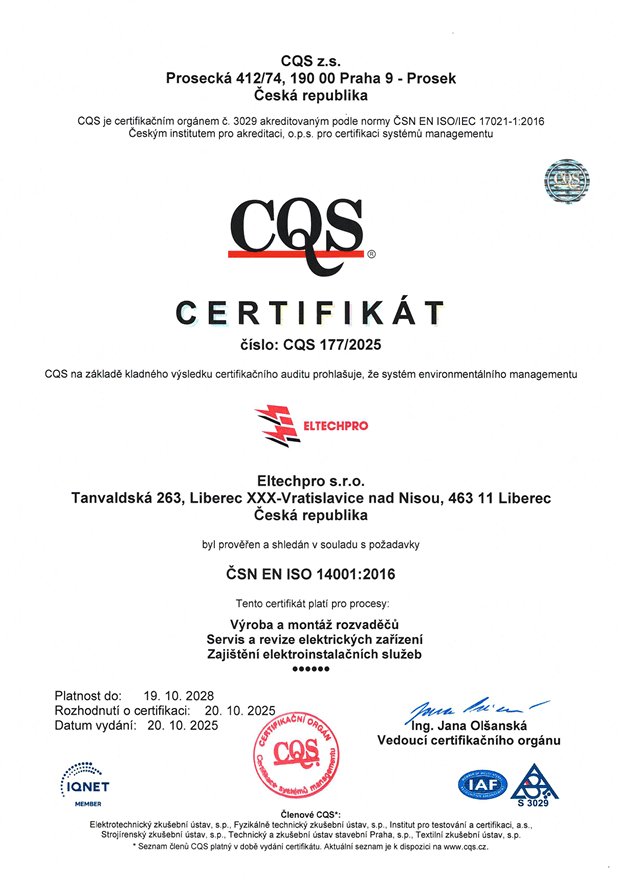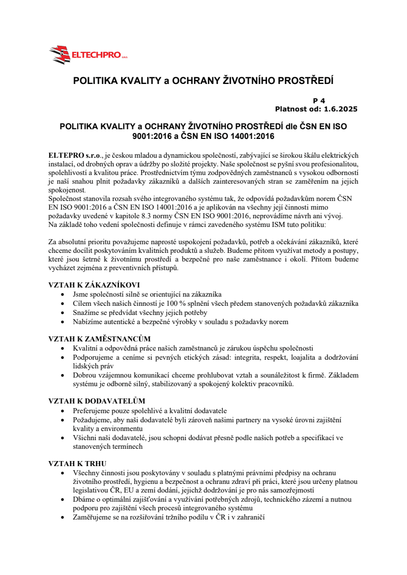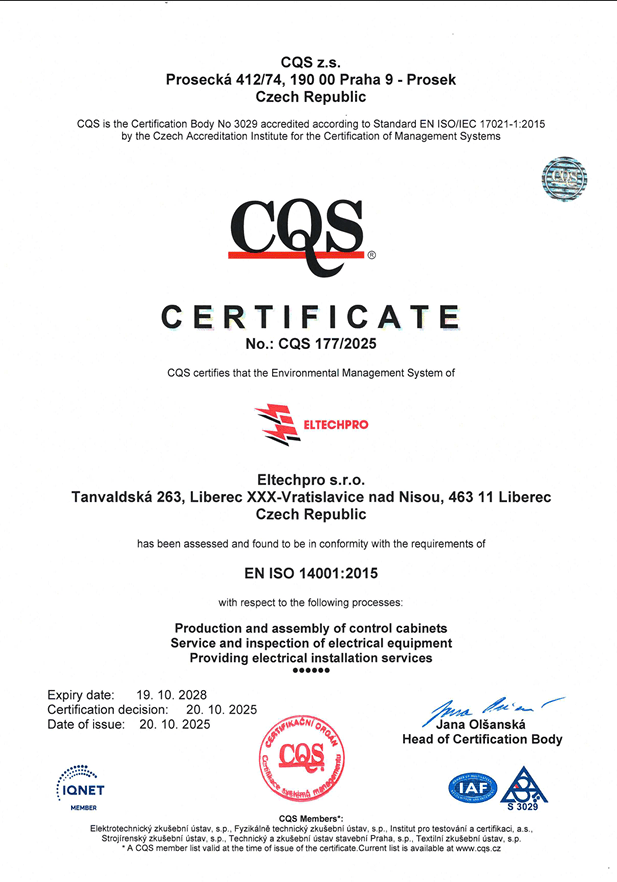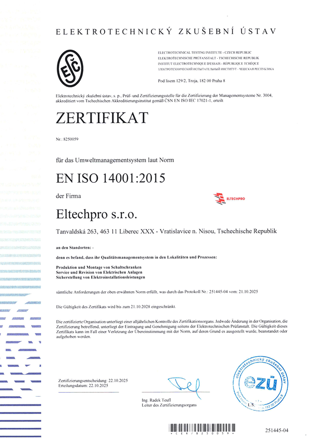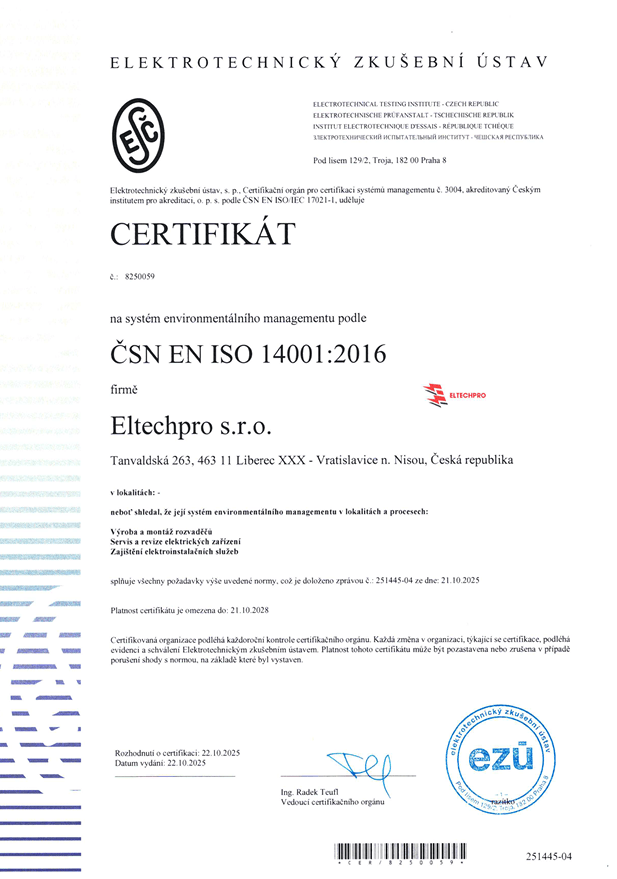 Společnost ELTECH PRO s.r.o. klade důraz na vysokou kvalitu poskytovaných služeb a zároveň na odpovědný přístup k životnímu prostředí. Naše činnost je v souladu s platnou legislativou a odpovídajícími normami.